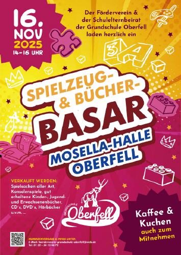 Am Sonntag, den 16.11.2025 findet in diesem Jahr wieder ein Spielzeug- und Bücherbasar der Grundschule Oberfell in der Mosella-Halle Oberfell statt. In der Zeit von 14 - 16 Uhr werden Spielsachen aller Art, Konsolenspiele, gut erhaltene Kinder-, Jugend- und Erwachsenenbücher sowie CD‘s, DVD‘s und Hörbücher oder Tonies verkauft. Zusätzlich ist mit Kaffee und Kuchen sowie Getränken auch für das leibliche Wohl vor Ort bestens gesorgt. Wer Spielsachen und/oder Bücher verkaufen oder spenden möchte, kann sich unter foerderverein-grundschule-oberfell@web.de oder unter 0152/56134672 eine oder mehrere Verkäufernummer(n) vergeben lassen. Pro Verkäufer-Nummer können bis zu 50 Bücher und alle anderen Artikel unbegrenzt angeboten werden. Die Abgabe erfolgt am Freitag, den 14.11.2025 (16 - 18 Uhr). Die Abholung ist für Sonntag, den 16.11.2025 (17:30 – 18:30 Uhr) vorgesehen. Bitte die Verkäufernummer in schwarz und den Preis in Rot auf den Artikeln mit Aufklebern anbringen. Zudem bitte die Verkäuferboxen mit der Verkäufernummer beschriften. Der Mindestverkaufspreis je Artikel liegt bei 1 € je Artikel in 0,50 € Schritten ansteigend. 2 € Startgebühr je Verkäufernummer sowie 15% des Verkaufserlöses kommen den Kindern der Grundschule zur Finanzierung von sinnvollen Projekten und damit der Förderung Ihrer Bildung zu Gute. Der Förderverein der Grundschule Oberfell freut sich auf Ihre Beteiligung und Besuch!